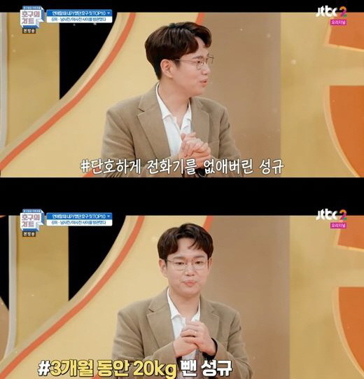 이어 장성규는 "이후 전화기를 없앤 뒤 3개월 간 20kg을 뺐다. 안경을 벗고 렌즈를 꼈다"라며 "날을 잡고 아내를 만났는데 놀라더라. 낯선 남자를 만나는 느낌을 줬다"라고 덧붙였다.