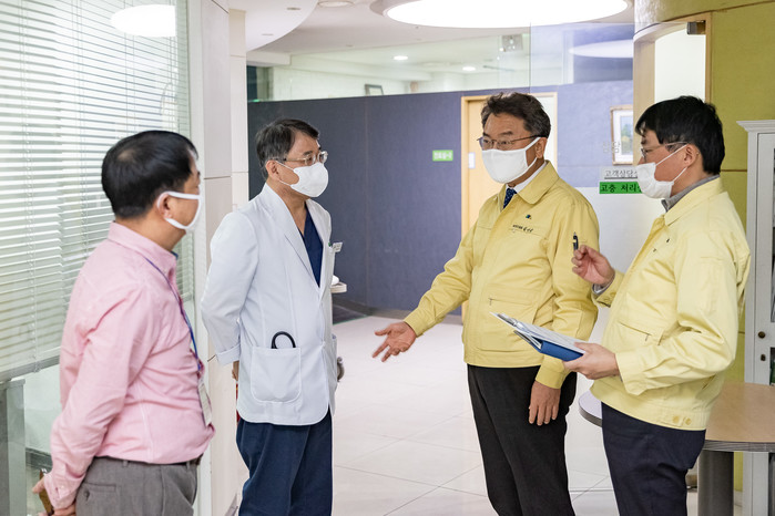 김선갑 서울 광진구청장은 17일 코로나19와 관련해 감염에 취약한 지역내 요양병원에 직접 방문해 방역체계를 점검하고 마스크와 손소독제를 배부했다. 김 구청장은 이날 구에 위치한 요양병원 3곳을 모두 방문해 덴탈마스크 총 6000개와 손소독제 총 60병을 전달했다. 사진은 리안요양병원에 방문한 김 구청장이 병원 관계자들과 이야기를 나누는 모습. (사진제공=광진구청)