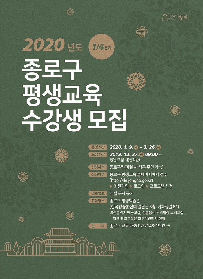 [시민일보 = 이대우 기자] 서울 종로구(구청장 김영종)가 주민의 자기 개발과 행복지수 향상을 위해 오는 9일부터 ‘2020년 1분기 평생교육 프로그램’을 운영한다.