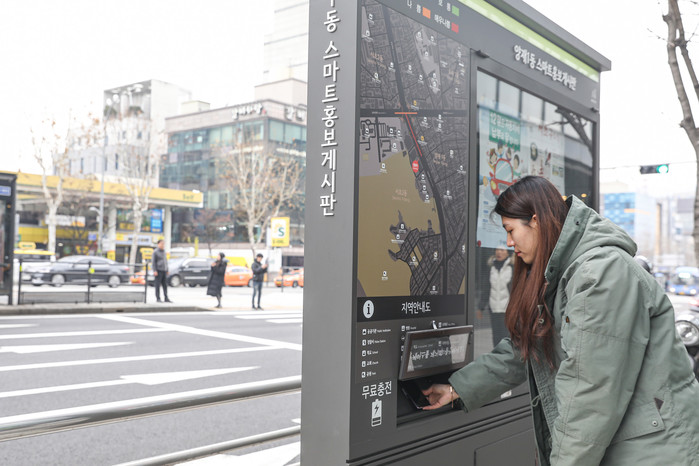 | 양재역 9번 출구에 설치된 스마트 홍보게시판에서 주민이 휴대전화를 충전하고 있다.(사진제공=서초구청) |