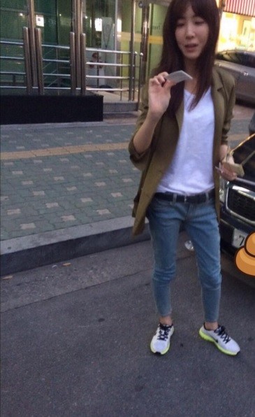 김이나는 공개된 사진 속에서 흰색 티셔츠와 청바지를 깔끔하게 매치한 패션을 선보이고 있다. 김이나의 늘씬한 몸매와 새하얀 피부가 돋보인다.