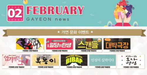 5명의 가연 회원에게는 역동적인 액션과 에너지 넘치는 퍼포먼스 공연 ‘파이어맨’의 오는 13일 공연 관람 기회를, 또 다른 10명에게는 동서고금을 막론하고 최고의 연애비법을 알려주는 음악극 ‘밀당의 탄생’ 오는 22일자 공연의 관람 기회를 제공한다.