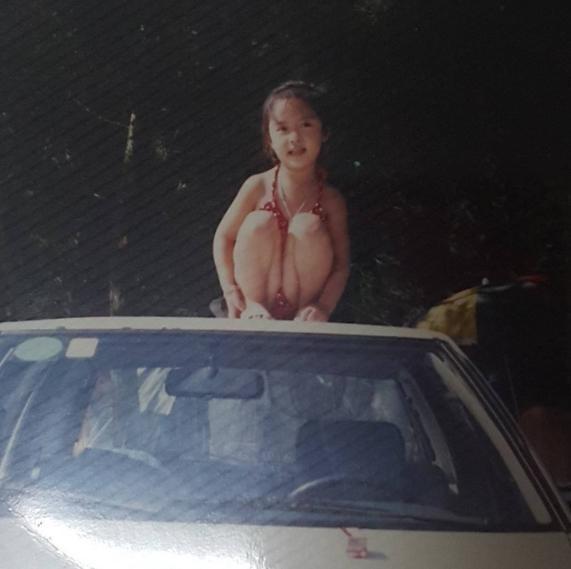 공개된 사진 속 어린 황정음은 하얀 승용차 위에 올라 앉은 채 해맑은 표정을 짓고 있었다.