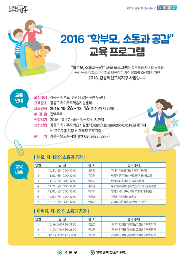 구 관계자는 “자녀와의 대화 단절로 많은 어려움을 겪고 있는 학부모들이 자녀들의 닫힌 마음 문을 열어 대화, 소통, 공감으로 서로를 이해하고, 이를 통해 건강하고 바람직한 가정 문화를 만들어 가는 변화의 계기가 될 것”이라고 말했다.