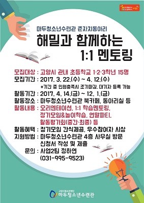 한편 청소년동아리 ‘해밀과 함께하는 1:1멘토링 사업’의 참가비는 전액 무료로 학습지도, 정기모임 시 간식제공, 우수참여자 시상 등 다양한 혜택이 제공된다. 단 교재비는 별도다.