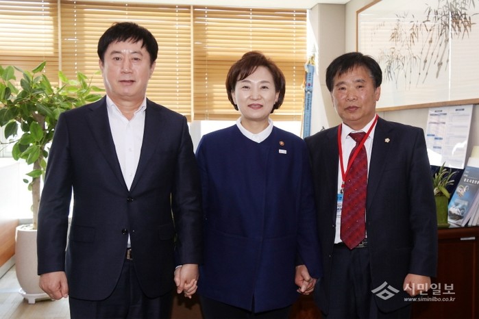 | ▲ 정찬민 용인시장(왼쪽부터)과 김현미 국토부장관, 이건영 용인시의회 의원이 기념촬영하고 있다. | ||