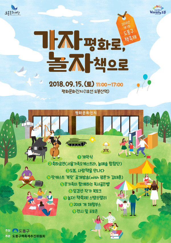 구에 따르면 종전에 구청 일원에서 진행돼 왔던 책축제는 올해 ‘가자 평화로, 놀자 책으로!’란 주제로 분단·평화란 두가지 상반된 의미를 함께 지니고 있는 구만의 이색 장소인 도봉동 평화문화진지로 개최장소를 넓혀 더 많은 지역주민들이 다양한 참여와 체험을 통해 책과 독서를 즐길 수 있도록 했다.