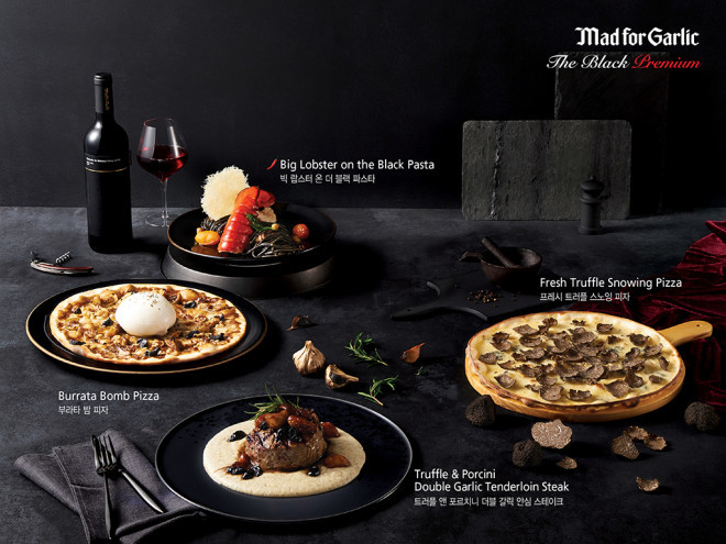 ‘더블랙 프리미엄으로 물들다’라는 테마로 선보이는 이번 더블랙 프리미엄 신메뉴 4종은 ‘마늘과 와인’이라는 매드포갈릭만의 독자적인 정체성을 바탕으로, 포르치니 버섯, 랍스터 테일, 부라타 치즈, 트러플 등의 진귀한 최고급 식자재를 사용하여 유니크한 레시피로 풀어낸 것이 특징이다.