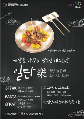 청소년이 운영하는 일일 레스토랑의 명칭은 ‘일단樂’으로 “일단 즐겁게 요리하고, 먹자!”라는 슬로건 아래 22일 오전 11시부터 오후 7시까지(브레이크 타임 오후 3~5시) 일산서구청소년수련관 2층에서 스테이크와 파스타, 서브메뉴를 판매할 예정이다.