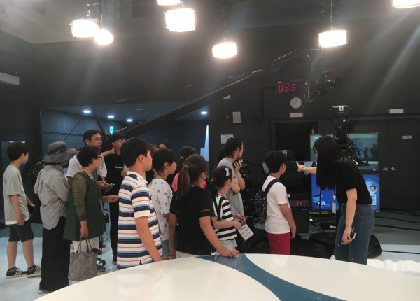 | ▲ 어린이 체험단이 TBS 교통방송국을 방문해 관계자로부터 방송 제작과정을 설명 듣고 있다. (사진제공=마포구청) | ||