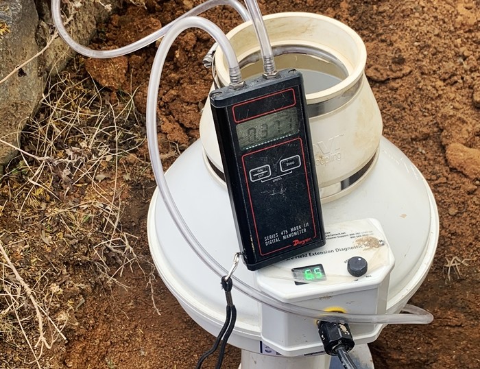 그렇다면 사전측정에 음압테스트와 양압테스트란 무엇일까? 먼저 음압테스트는 쉽게 말해 토양배기 설치 여부를 결정할 수 있는 테스트다. 음압테스트기를 설치한 하부의 천공지점과 일정 거리를 띄워 바닥에 천공하고 음압테스트기를 사용해 공기를 빨아 당겼을 때 음압이 미치는 범위를 측정하는 테스트다.