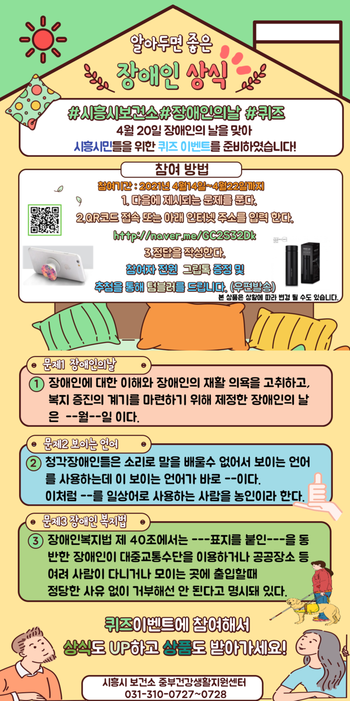 지역주민 누구나 참여 가능하다. 4월 14일부터 22일까지 9일간 진행되며, QR코드 혹은 인터넷 주소로 접속해 장애인 상식퀴즈 답변을 제출 하면 참여할 수 있다. 참여자 전원에게는 인식개선 그립톡을 증정하고, 정답자 중 추첨을 통해 자택으로 텀블러를 배송한다.