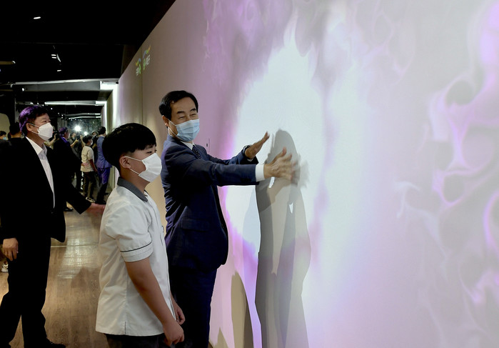 | ▲ ‘서대문구 평생학습관·융복합인재교육센터’에서 문석진 구청장(오른쪽)이 한 아동과 이야기를 나누고 있다.(사진제공=서대문구청) |