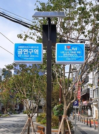 구는 구민 건강증진과 담배 연기 없는 환경 조성을 위해 올해 9월 서울시 최초로 ‘태양광 LED 가로등 금연안내시스템’을 설치했다.