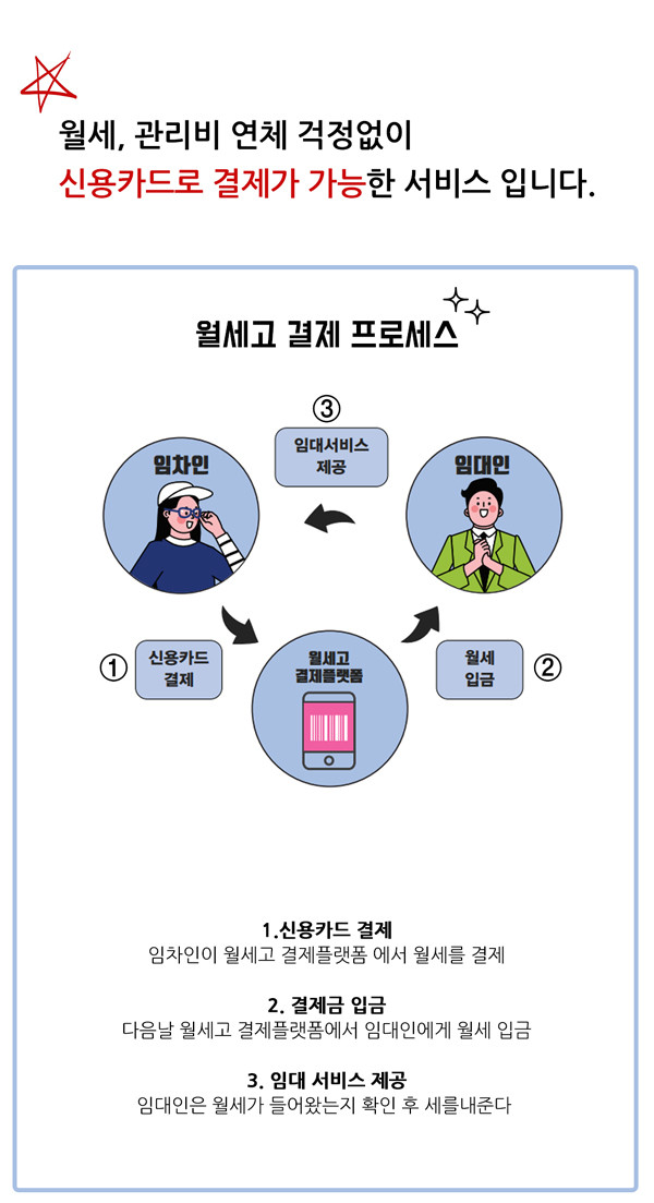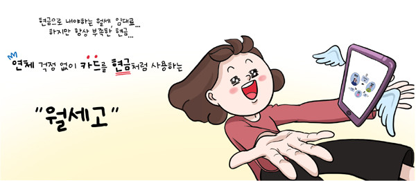 임차인이 신용카드 결제 플랫폼 ‘월세고’를 이용하여 금액을 설정하면 다음날 임대인에게 현금으로 입금되는 서비스이다.
