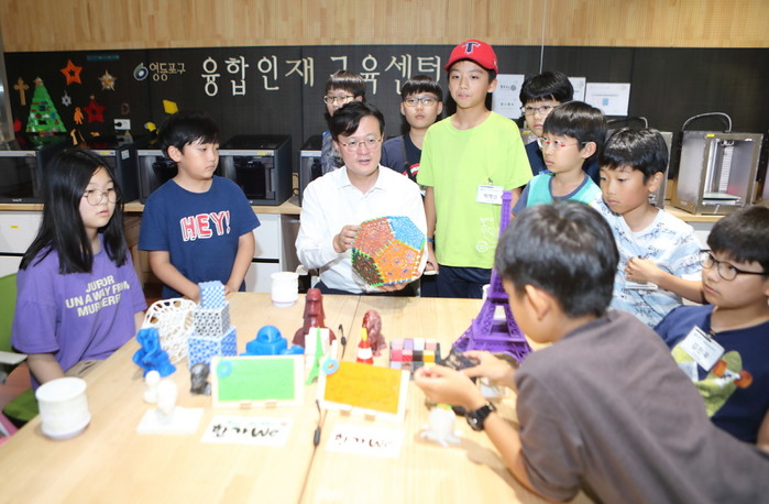 | ▲ 채현일 구청장(가운데)이 융합인재교육센터에서 학생들과 3D프린터로 제작한 물건들을 함께 살펴보고 있다. (사진제공=영등포구청) |