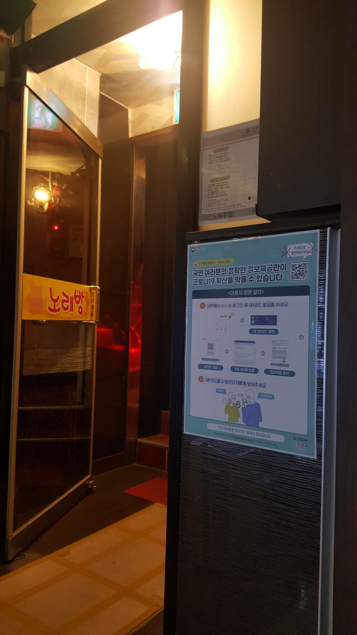 | ▲ 지역내 노래주점에 전자출입명부 QR코드 안내문이 부착된 모습. (사진제공=강북구청) |