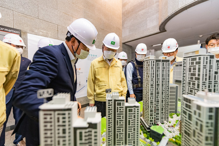 | ▲ 김선갑 구청장(가운데)이 자양1재정비촉진구역 도시정비형 재개발 건축모형을 살펴보고 있다. (사진제공=광진구청) |