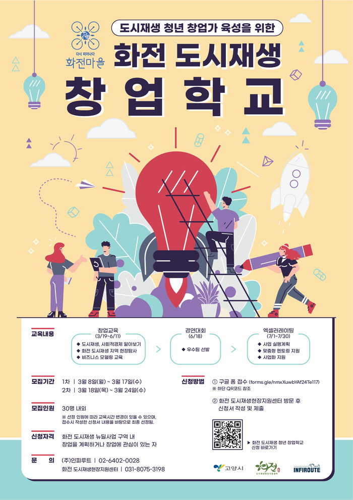 창업학교 및 관련 사업에 대해 궁금한 사항은 ㈜인피루트 또는 화전 도시재생현장지원센터로 문의하면 된다.