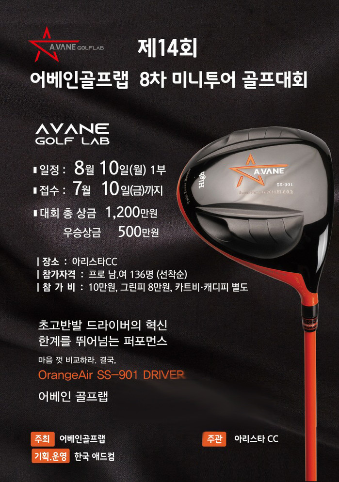 오는 8월 10일 충청남도 논산시 아리스타CC에서 개최되는 ‘제14회 어베인골프랩 8차 미니투어 골프대회’는 코로나19의 확산으로 인해 골프대회 유치가 어려워진 상황에서 국내 골프발전을 위해 어베인골프랩이 준비한 대회로, 아리스타CC 주관, 한국애드컴 기획 및 운영으로 치러진다. 코로나19에 대비해 철저한 방역과 규칙을 준수하도록 준비되고 있기도 하다.