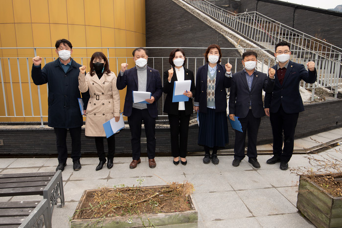 | ▲ 은평역사한옥박물관 외벽공사 현장에서 기념촬영을 하고 있는 행정복지위원들. (사진제공=은평구의회) |