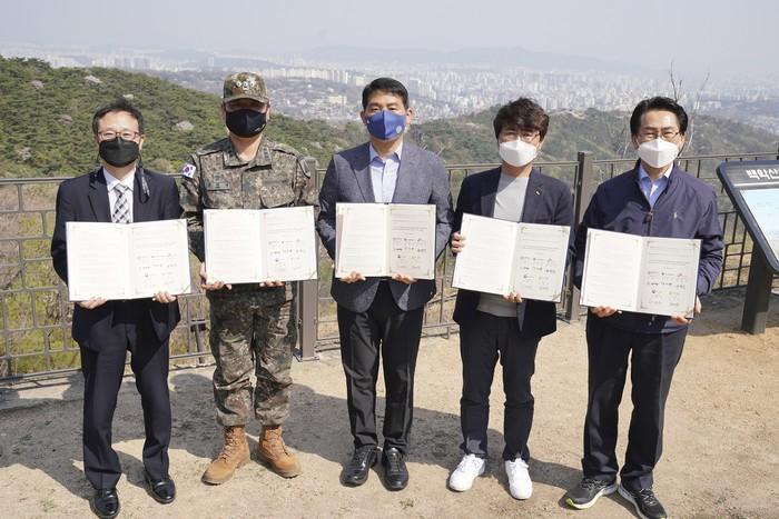 | ▲ 북악산 역사문화 콘텐츠 제작 업무협약식 모습(왼쪽부터 문화재청 강경환 차장, 수도방위사령부 박재열 참모장, 대통령경호처 우상엽 경비안전본부장, SK텔레콤 MR 서비스 양맹석 담당, 김영종 구청장). (사진제공=종로구청) |