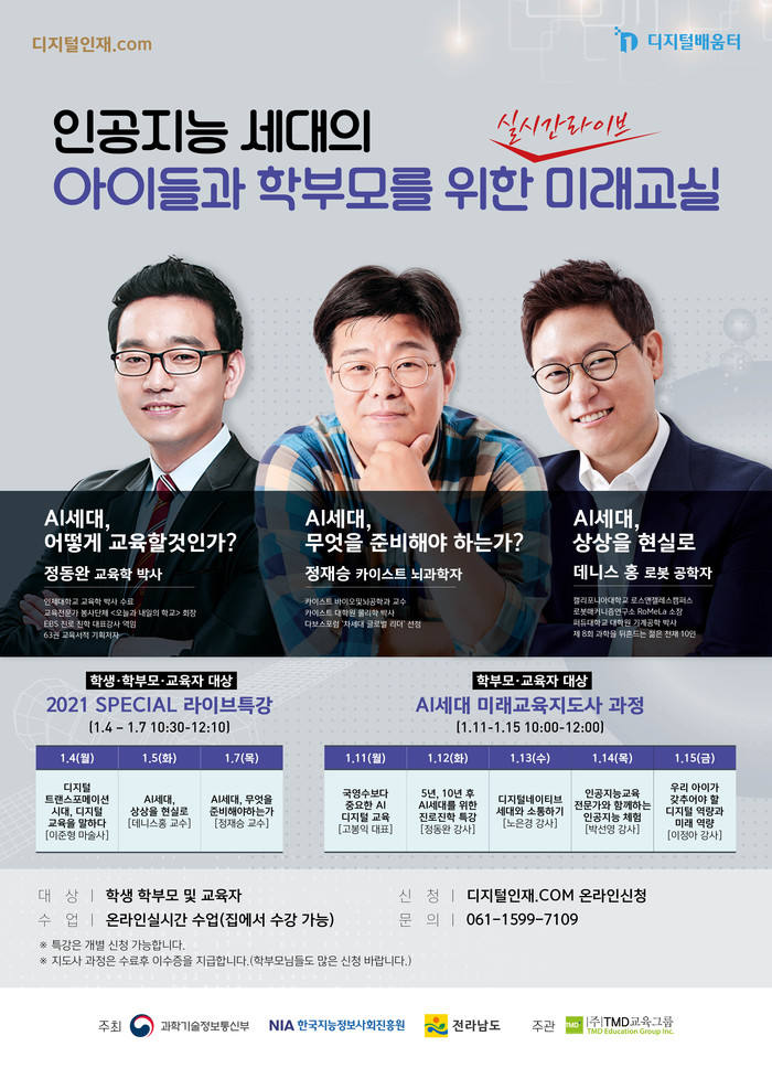 인공지능과 함께 살아가기 위한 'AI 리터러시 특별수업'이 학생과 학부모, 그리고 교육자들을 대상으로 1월 4일, 5일, 7일 3일간 10:30-12:10 진행된다.