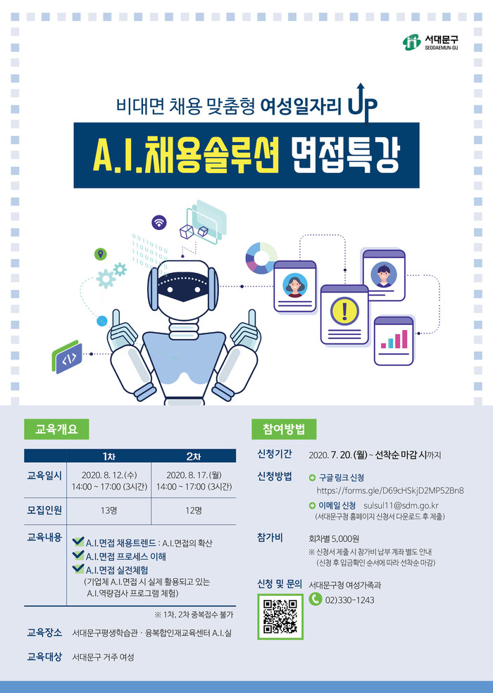 [시민일보 = 홍덕표 기자] 서대문구(구청장 문석진)가 코로나19로 비대면 채용이 확산되고 있는 가운데, 지역내 여성 구직자들의 취업역량 강화를 위해 오는 8월12일과 17일 '인공지능(AI) 채용솔루션 면접 특강'을 개최한다.