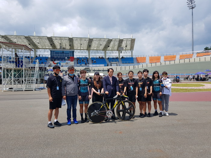 | (출처=전라남도체육회) 김재무 회장이 전남 싸이클 선수단을 찾아 격려하고 있다. |