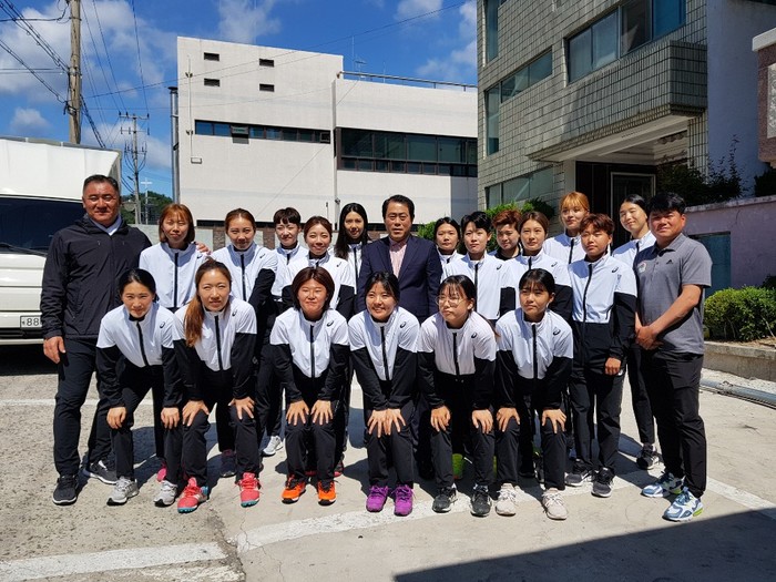 | (출처=전라남도체육회) 김재무 회장(사진/뒤줄 중앙)이 강원도에 출천한 목포시청소속 여성 하키 선수단을 격려하고 기념포즈를 취하고 있다. |