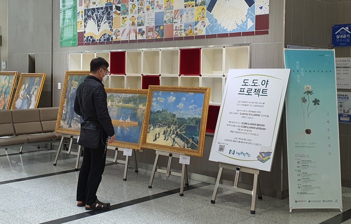 | ▲ 도도야 프로젝트로 노원정보도서관에 전시된 인상주의 화가들의 명화 레플리카 작품들을 관람하고 있는 모습. (사진제공=노원구청) |