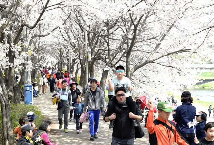 | ▲ 지난해 벚꽃이 만개한 중랑천에서 시민들이 산책로를 거닐고 있다. |