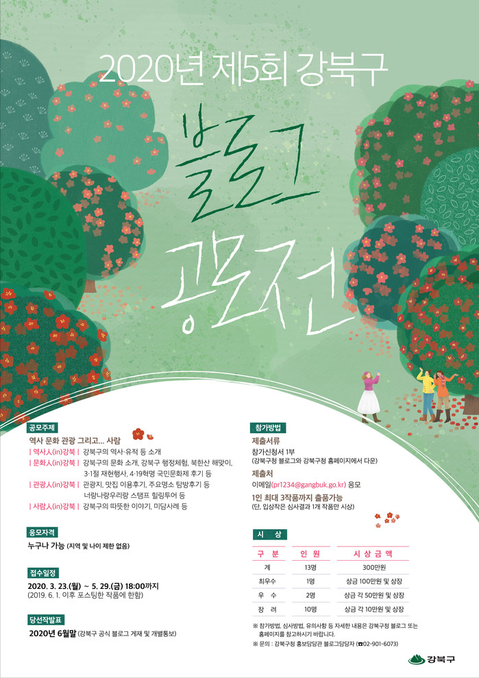 [시민일보 = 홍덕표 기자] 강북구(구청장 박겸수)는 지역의 다양한 매력이 담긴 이야기를 발굴하고 시민들과 공유하기 위해 ‘제5회 강북구 블로그 공모전’을 개최한다고 25일 밝혔다.