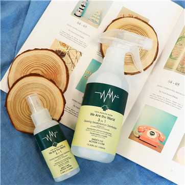 500ml 대용량 펌프형 타입으로 학교, 유치원, 화장실 이용 후, 핸드폰 사용 후, 사무실 책상, 유아용 장난감 등 언제 어디서나 간편하게 사용가능한 제품이다. ’위아더월드 3in1 쇼킹액션 워터(we are the world 3in1 shocking action water)’는 100ml. 400ml 용량이 구분되어 휴대가 가능하고, 페렴구균, 대장균, 비브리오균, 녹농균, 살모넬라균, 황색포도상구균 등 7대 유해균을 99.9% 살균해주는 제품이다. 사용법 역시 분사형 타입으로 살균 및 소독 세정이 필요한 모든 곳에 쉽게 뿌리기만 하면 된다.