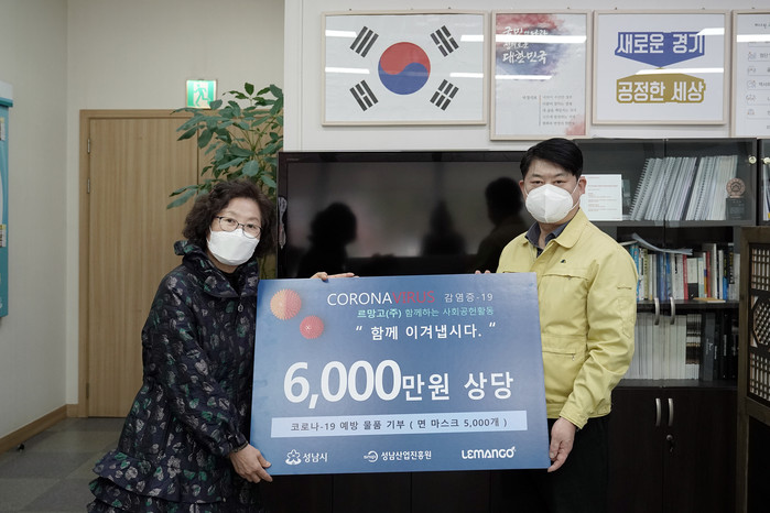 20일 성남시청에서 르망고㈜ 김준례 대표와 성남시 은수미 시장, 이한규 부시장, 성남산업진흥원 류해필 원장, 박병호 사업추진본부장이 참석한 가운데 코로나19 확산 예방을 위한 마스크 전달식이 개최됐다.