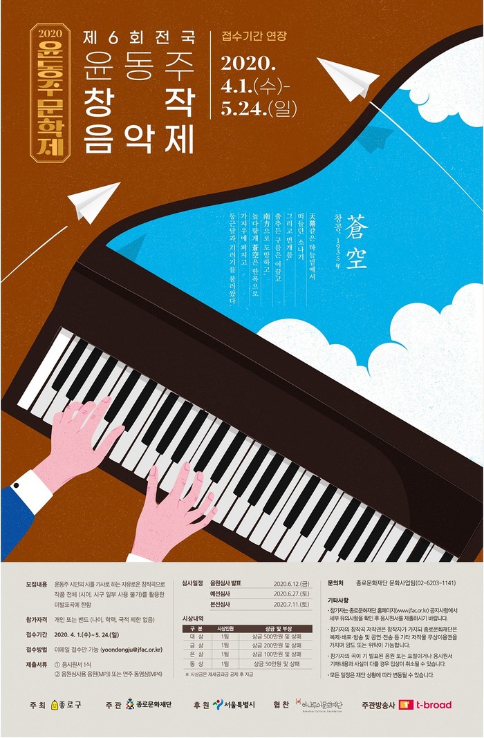 ‘윤동주 창작음악제’, ‘윤동주 시화공모전’과 관련하여 보다 자세한 사항은 종로문화재단 홈페이지를 확인하거나 종로문화재단 문화사업팀으로 문의하면 된다.