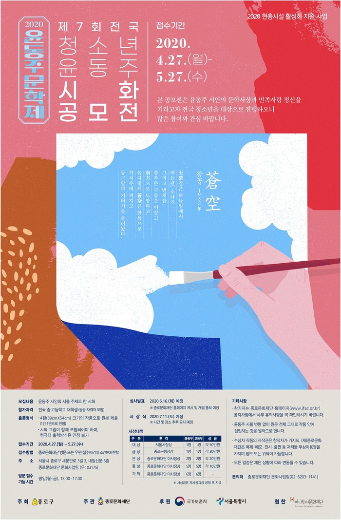 윤동주 시화공모전은 전국 청소년을 대상으로 윤동주 시인의 시를 주제로 한 시화 작품을 공모한다. 시와 그림이 함께 포함된 4절 크기의 작품을 오는 27일까지 종로문화재단 문화사업팀(종로구 새문안로3길 3, 내일신문 6층)으로 방문 또는 우편 제출하면 된다.