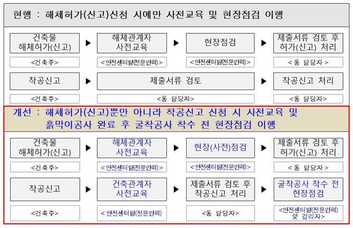 또, 해체공사 시 ‘건설산업기본법 시행령’ 제40조에 따른 전문가(건설기술인)를 현장에 배치하고, 현장대리인이 상주 관리하도록 의무화 했다.