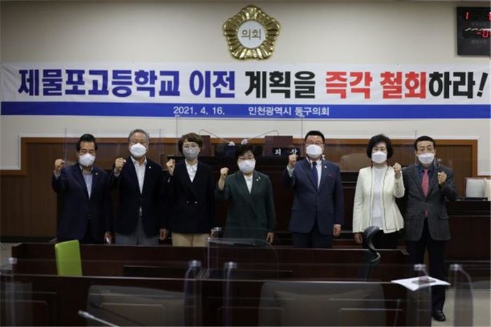이에 구의회는 6만 5000여 동구주민, 학부모 학생의 목소리를 대변하여 인천광역시 교육청을 대상으로 ▲제물포고등학교 이전 입장 즉각 철회할 것 ▲제물포고등학교 위상 회복을 위한 투자 계획을 마련해 시행할 것 ▲원도심 교육 환경 개선 방안을 조속히 마련하여 시행할 것을 강력하게 촉구했다.
