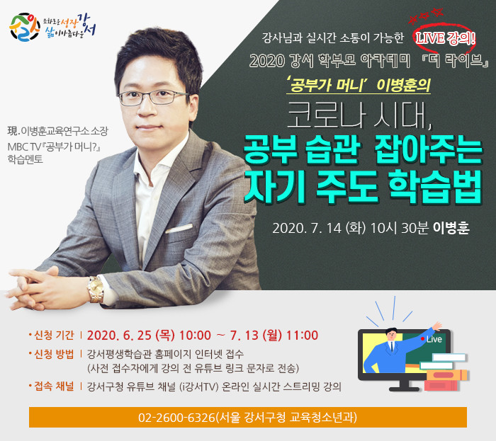 MBC TV '공부가 머니?' 컨설턴트인 이병훈 강사를 초청해 '코로나 시대, 공부 습관 잡아주는 자기 주도 학습법'을 주제로 교육한다.