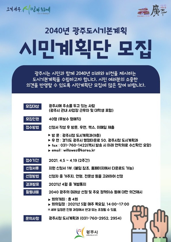 이를 위해 시는 오는 19일까지 40명의 시민계획단을 도시교통·경제문화·환경방재·교육복지 등 4개 분과로 모집할 예정으로 광주시에 주소를 두고 있는 모든 시민은 참여가 가능하다.
