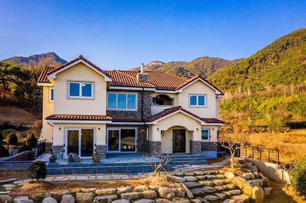 또한 “이번 주택은 스페니쉬 기와를 올린 북유럽풍 디자인을 국내에 맞게 변형해 적용했다. 외부와 내부의 동선을 현대 생활에 맞게 재해석했으며 넓은 면적을 충분히 활용해 대형주택임에도 버려지는 공간을 최소화 한 알찬 구성의 평면으로 완성했다. 자연경관이 워낙 좋은 곳이어서 주변과 잘 어울리도록 따뜻한 느낌의 기와를 이용해 시너지를 낼 수 있는 디자인을 하려고 했다”라며 시공의도를 전했다.
