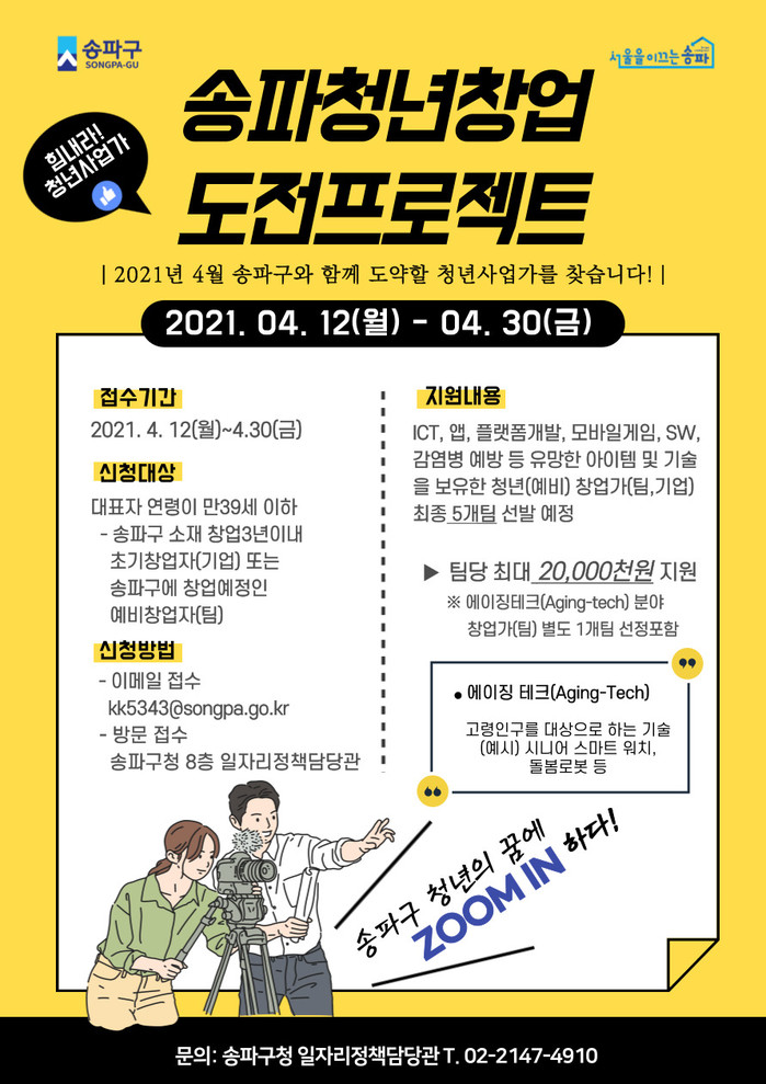 구는 지난해 ‘송파 청년창업도전프로젝트’를 통해 코로나19로 투자유치에 어려움을 겪는 청년창업자 10개 기업을 지원했다. 그중 7개 기업에서 상시근로자 수(12명 증가)와 매출액 증가의 성과를 도출하기도 했다. 올해에는 2019년, 2020년 참여기업들의 현황을 파악하고 송파ICT청년창업지원센터와 연계하여 사후관리 실시 할 계획이다.