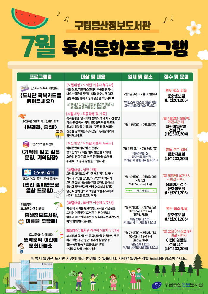 스크래치를 이용한 독서 이벤트 픽북 카드, 초등학생과 가족들의 독서 습관 형성을 책임질 독서달리기, 흥미로운 인스타그램 이벤트와 여름맞이 도서관 미션 이벤트, 새로운 온라인 강의 드로잉 수업, 어린이 문화나눔소 등 각양각색의 프로그램들이 대기하고 있다.