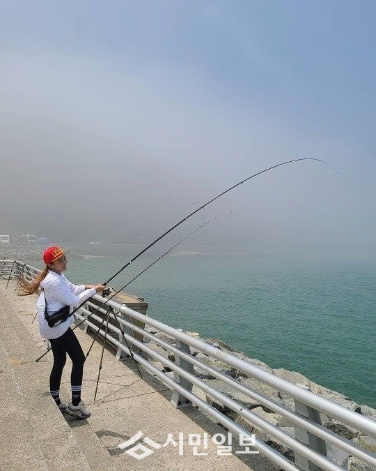 사진 속 강은비는 낚싯대를 잡고 낚시에 열중하며 환한 미소와 해맑은 모습을 드러내 팬심을 사로잡았다.
