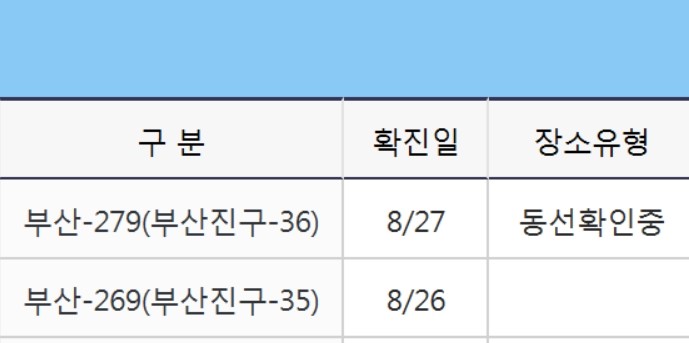 이날 부산시 보건당국은 전날 1천3명을 검사한 결과 9명(265번∼273번)이 양성 판정을 받았다고 밝혔다.