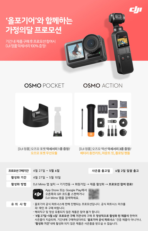 DJI 공식 수입원인 올포기어는 '오즈모 포켓 & 액션' 구매자를 대상으로 11번가, 올포기어 공식 사이트 및 네이버 스토어 등에서 구매자들에게 최대 14만원 상당의 혜택을 제공하고 있다.