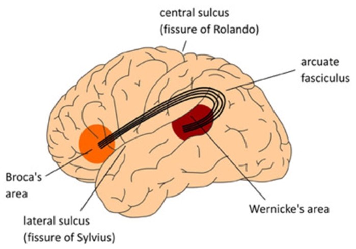 브로카 실어증은 아래이마엽의 후방에 있는 브로카 영역, 즉 말을 산출하는 영역이 손상되어 다른 사람의 말을 이해하는 데 지장은 없지만 말을 유창하게 하지 못한다. 베르니케 실어증은 위관자이랑의 후방에 있는 베르니케 영역, 즉 말을 이해하는 영역이 손상되어 말은 유창하게 할 수 있지만 말에 조리가 없으며 다른 사람의 말을 이해하지 못하는 증상을 보인다. 전도 실어증은 활꼴다발에 국한된 병적인 변화로 인해 따라 말하기 장애가 두드러지게 나타나며, 유창성이나 이해력의 문제는 보이지 않는 것으로 알려진다.