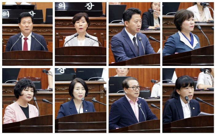 | ▲ (왼쪽상단부터 시계방향으로) 변종득, 김효숙, 이주현, 김은하, 김영림, 장순욱, 조진희, 정유나 의원이 구정질문을 하고 있다.(사진=동작구의회 제공) |