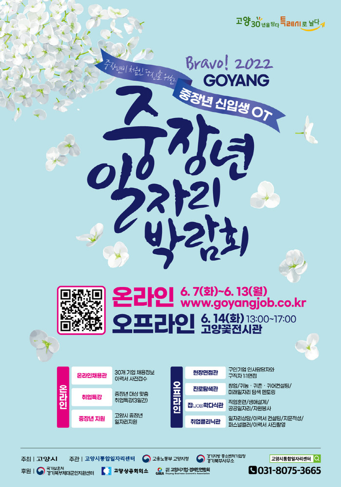 [고양=이기홍 기자] 고양시가 오는 6월 7일부터 6월 14일까지 「Bravo! 2022 고양시 중장년일자리박람회」를 처음으로 고용노동부와 공동주최로 개최한다.